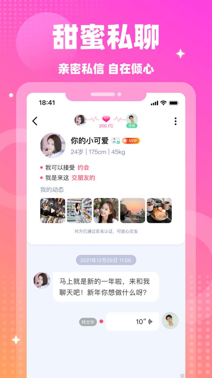 3、和喜欢的TA聊天互动能够快速增近感情哦,可以通过文字、语音、图片等多种形式任你选择,更有小礼物可以拉近你们的关系哦。