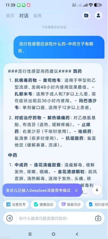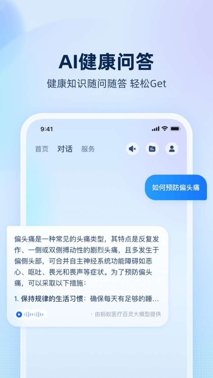 2、AI健康知识问答:可以通过文字、语音等形式提问关于医院、医药、疾病、健康、运动、饮食等相关问题,安诊儿会给出可靠答复。