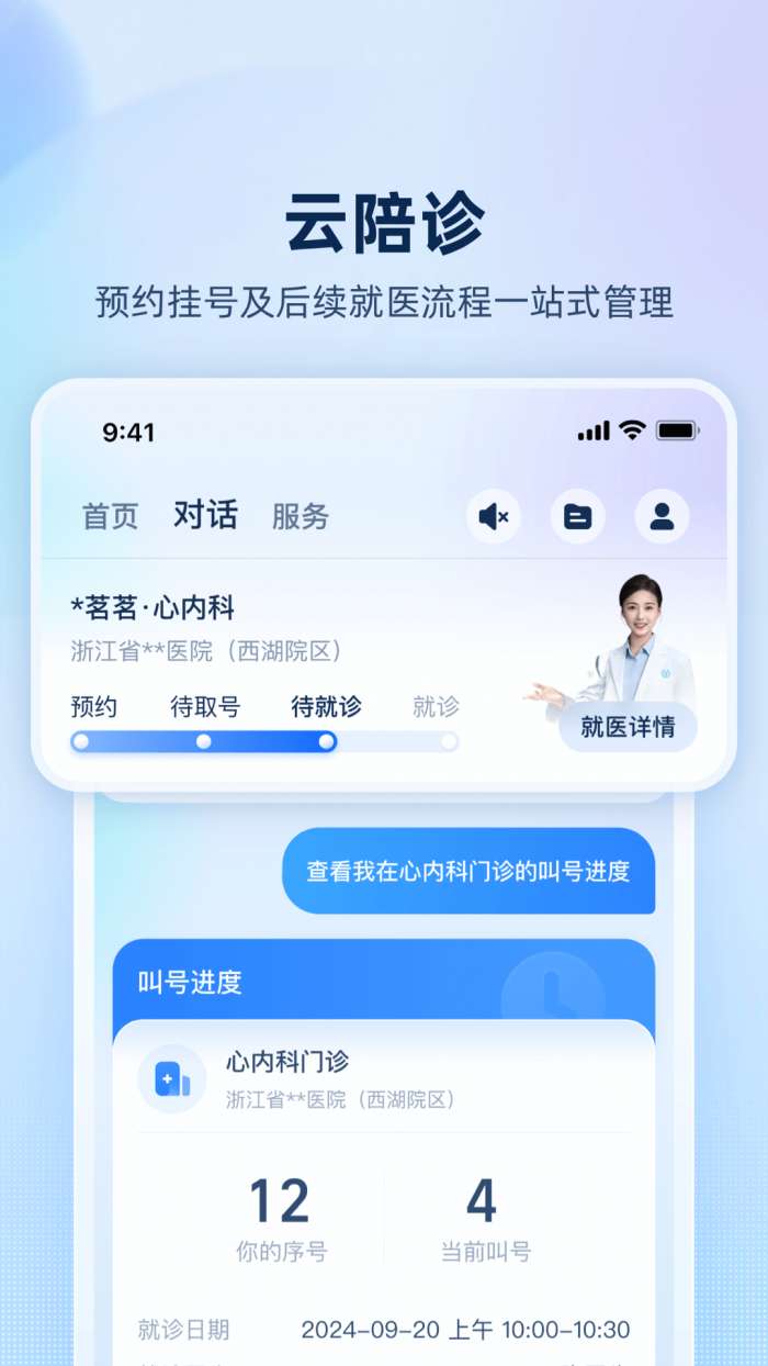 1、云陪诊:可以在安诊儿中发起医院预约、签到、检查、就诊、支付等一系列的相关流程节点。
