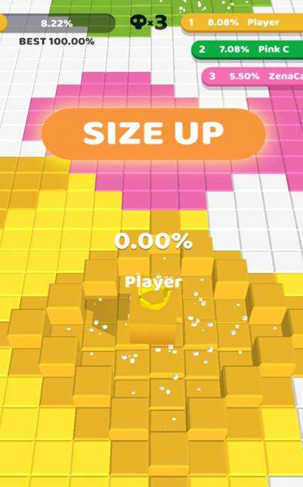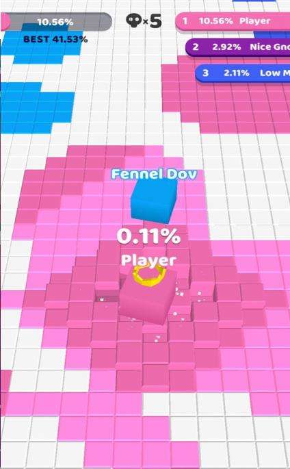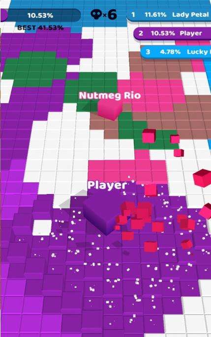 方块摇滚这款游戏中,大家可以选择一个皮肤方块,然后在游戏的场景中快速地移动,跟着音乐节奏,把版面中白色的方块全部染成属于自己的颜色。面积越大,你的名字就会上升,这样就可以攻击比你占地面积较小的色彩方块。一个房间中最多有三个玩家一起PK在这里,只要让自己占的比例最大,就能够获胜。最好是100%当然肯定对手也不会输给你。