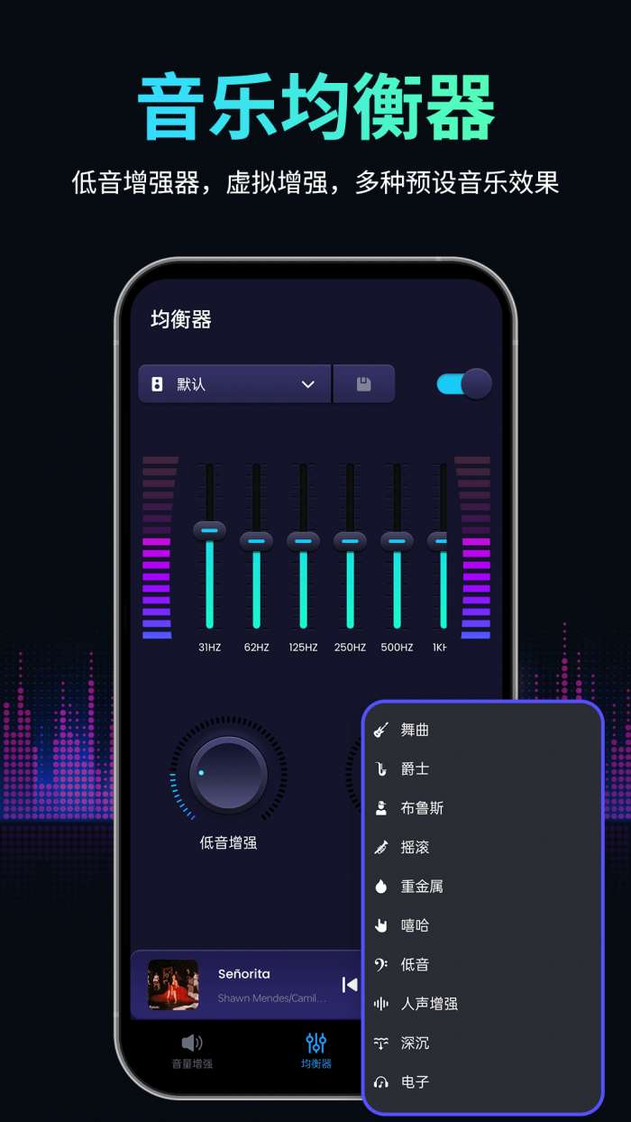 4、强大的音乐均衡器,具有20多种专业预设声音效果,五频段音乐均衡器,均衡器音量放大器。