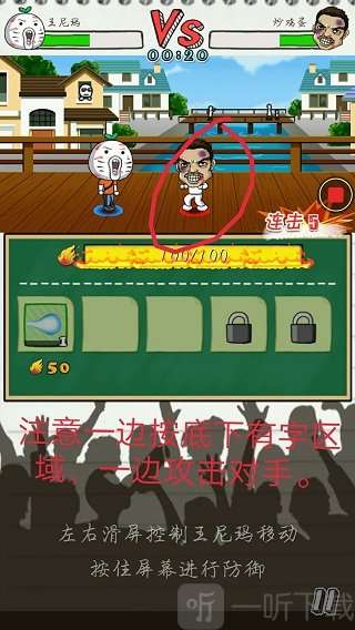 3. 其中的操作技巧为:通过左右滑动来控制王尼玛移动,按住屏幕即可进行防御,屏幕下方设有技能按钮。技能越强大,对敌人造成的伤害就越高。需特别留意的是,点击技能时务必要选在关键时刻。