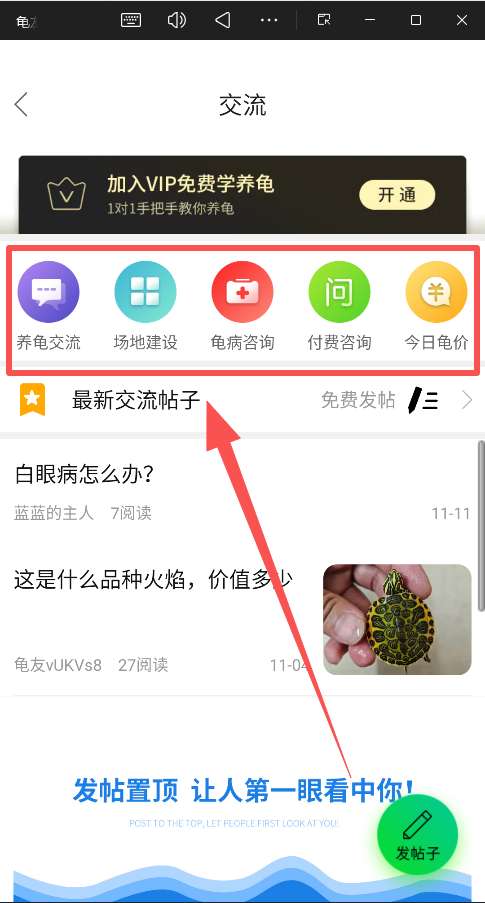 3、浏览“主页”和“发现”部分的帖子,学习养龟知识,了解市场趋势。