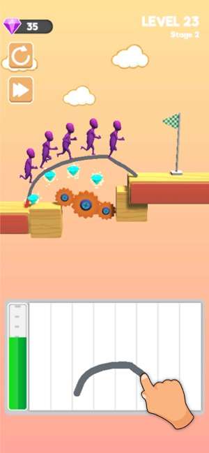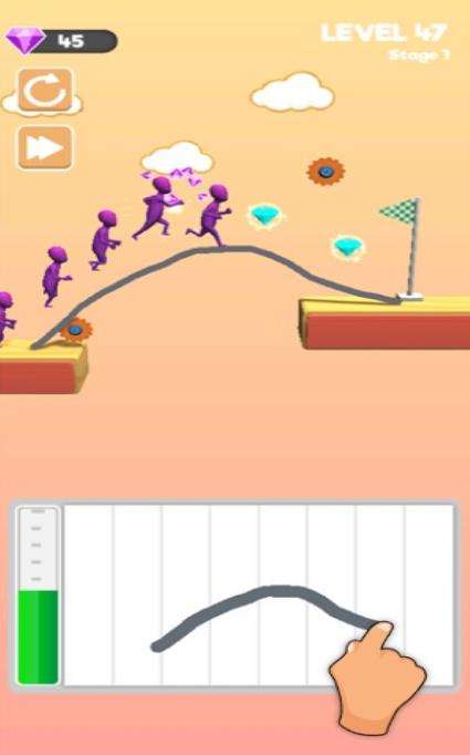 牵引桥在这款游戏中玩这么压错的就是利用什么指绘画的方式,让游戏中的人物能够顺利的通过你绘制的通道到达终点过程中,你会看到游戏中随机缝里的一些奇观,还有就是可以收集的钻石。这款游戏不是很考验大家的绘画能力,只要简单的行述职,或者是一个弧线就可以了根本就不是很难,而且里面的通道中还会放出一些可以弹射角色的道具,可以帮助里面的人物弹跳起来,但是或者说一定要小心,不要让他们碰到的齿轮。
