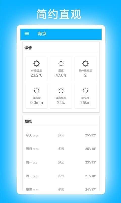 小卓天气这是一款非常方便实用的天气预报生活服务类软件,用户下载之后,它会根据你当前位置自动进行定位和播报,用户下载之后,可以随时随地在线观看,24小时之内的天气变化走向,短则两个小时之内天气走向预报,长则15天之内,天气走向都可以进行在线预测,有需要的用户不要错过。