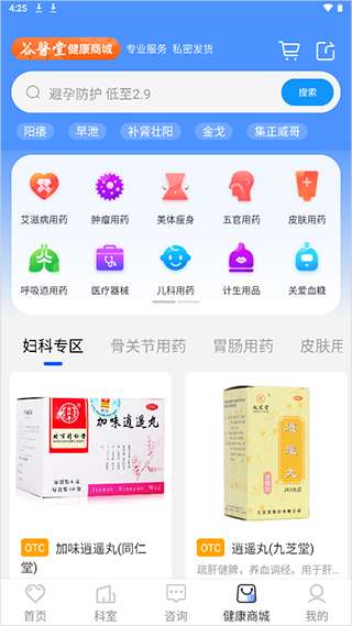 1、当用户进入应用的健康商城页面后,可以进入湖南顾毅堂移动网上药房,根据自己的情况购买药品。