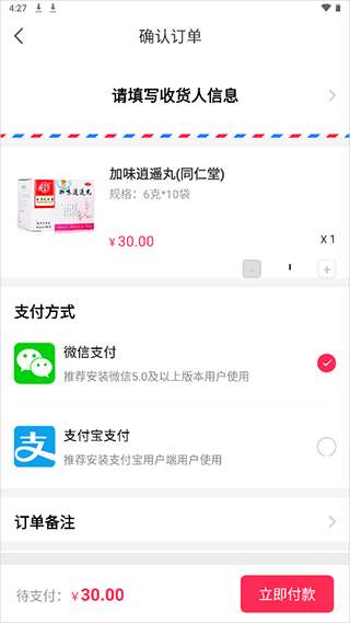 3、付款前,请先填写送货信息,然后您可以使用微信Pay或支付宝付款。