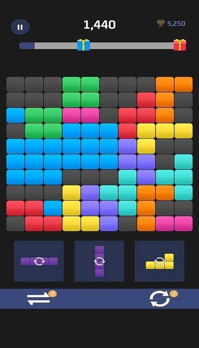 2、当横向或纵向任意一整行或整列被方块完全填满后,即可消除并获得得分;