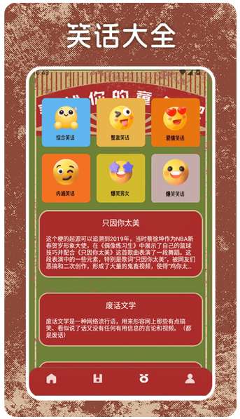 1、笑话分类 软件中的笑话资源分类明确,方便用户选择感兴趣的阅读。