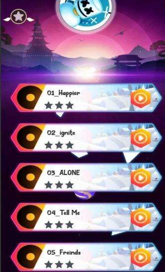 1、在这里的每一首歌都是由三颗星星组成的三个阶段,第一个阶段是比较简单,而且节奏是正常的,越到后面就会越难,而且最后一个阶段则是极速版哦。
