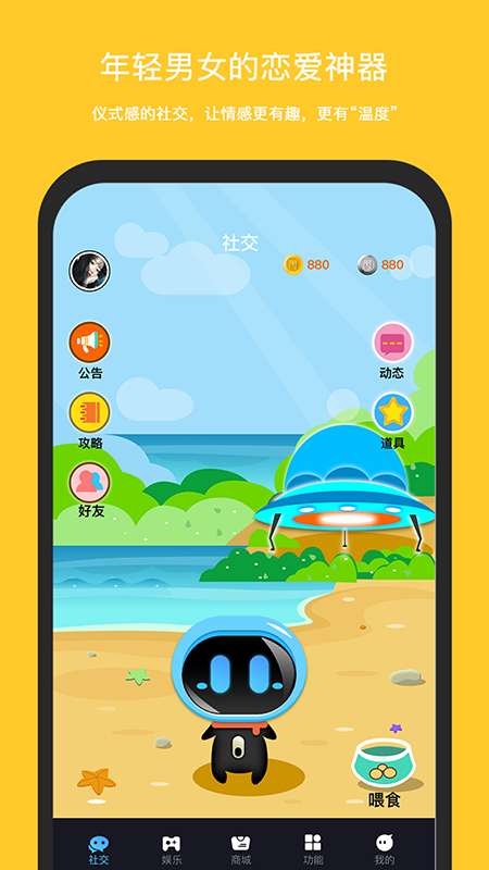 一丙是一款智能电子机器人软件,简单的说就是电子宠物,这里采用非常卡通萌萌的ui设计,在这里这只宠物还能帮助你完成一些手机上的便捷功能,您可以陪它聊天,陪它玩游戏,陪它互动,当然你也需要照顾它的日常起居,将机器人养得壮壮的,平台还内置了诸多的社交功能,您可以与诸多电子宠物伙伴们一起交流,愉快的玩耍,在这里打造属于你们的人机互动,是一款有着诸多实用功能以及黑科技的家庭电子宠物软件平台。