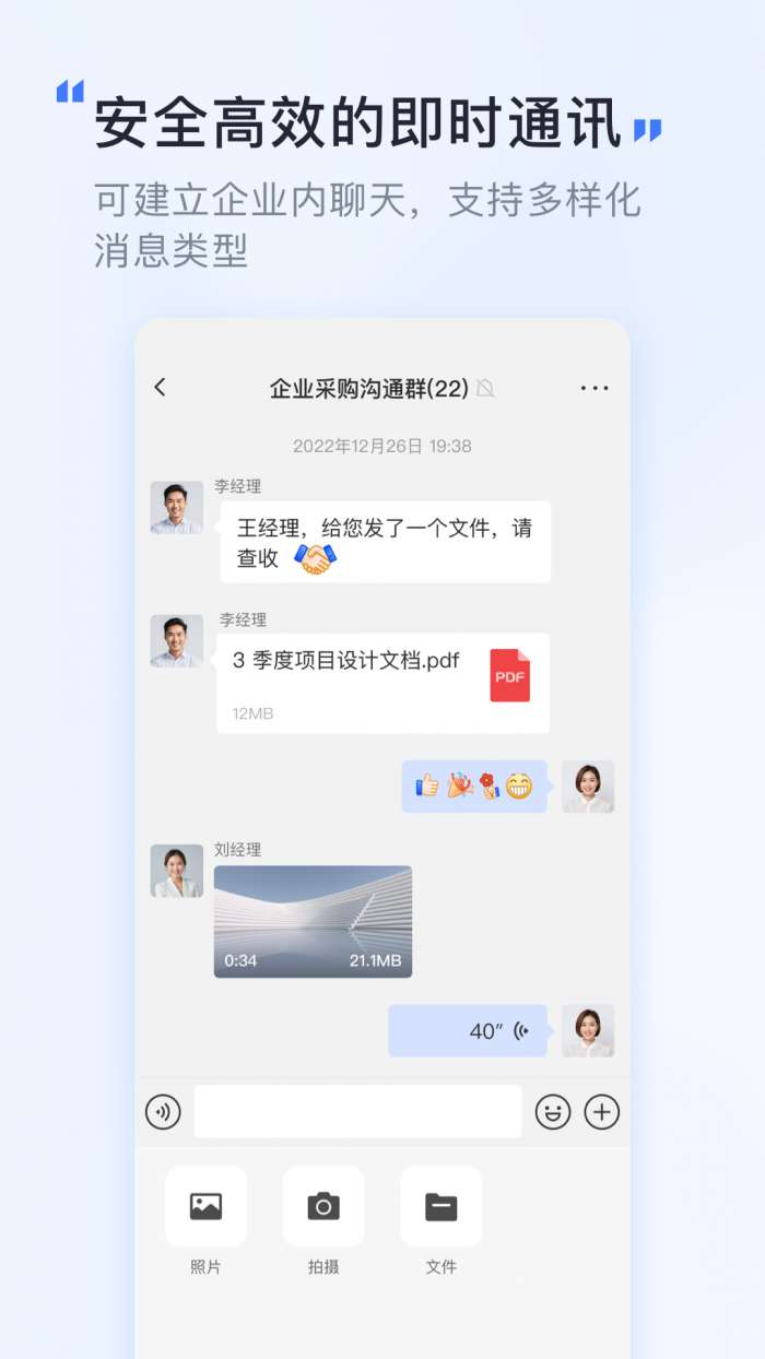 1、同事之间发消息不靠微信也能搞定,文字、照片、小视频、录音、文件随便传,聊完还能撤回,办公私密性更强。