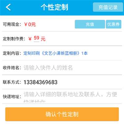 7、输入收件人的姓名和地址,然后单击“确认定制”进行付款。