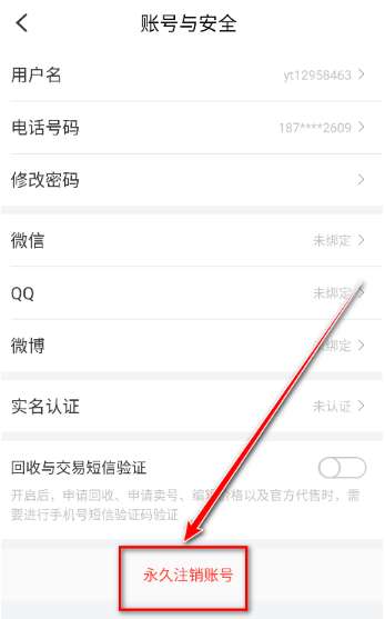 4、在账号与安全页面中,点击“永久注销账号”选项,进入账号注销流程。