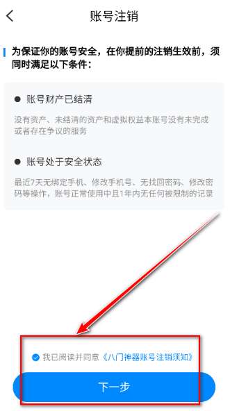 5、页面会显示《八门神器账号注销须知》,阅读后勾选“我已阅读并同意”,再点击“下一步”。