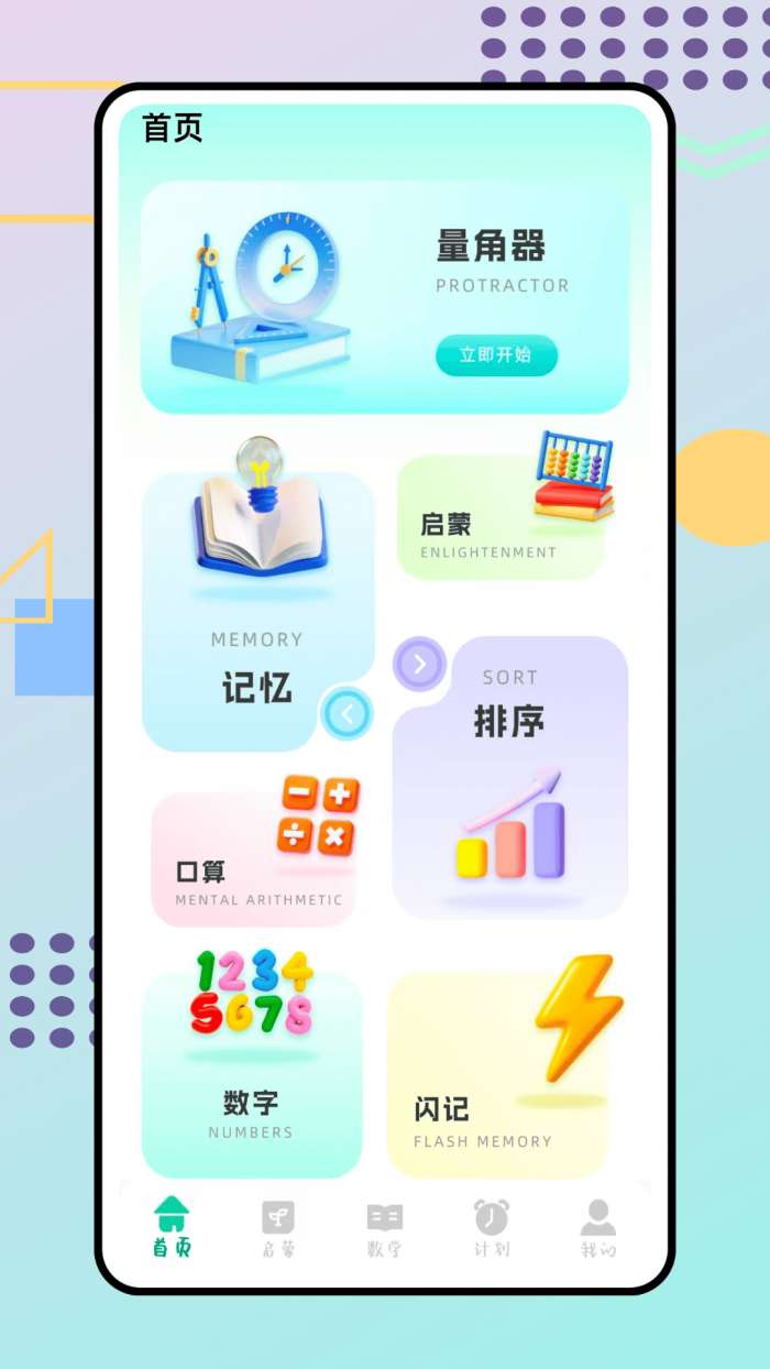 3、首页清晰地展示了记忆排序、口算、数字等核心模块。点击进入相应的学习界面。