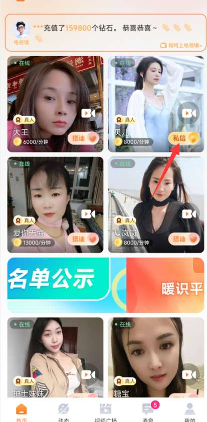 1、在首页中查看系统推荐的用户,找到你喜欢的用户点击私信。