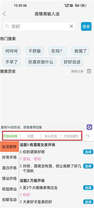 5、如下图所示,这就是输入法界面了,除了可以像常规输入法那样使用,还有各种开场语,话题可以便捷选择。