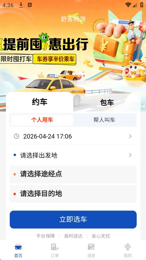 自主选择出行时间、出发地与目的地,在线选车一键下单,轻松完成预约打车。