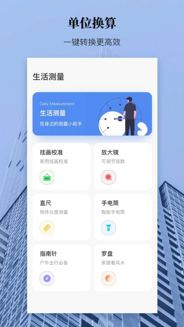 手机尺子工程测量是一款非常实用的手机测距软件,为用户提供多种测量工具,随时随地在线测量距离,长度,宽度等,自由快速进行计算,能完全满足所有使用需求,还具有全新的界面设计,可以瞬间将手机变成测量工具,允许用户自由浏览准确的测量数据,自由享受优秀的测量服务和体验,还可以执行各种公式计算转换模式,包括数字计算,长度计算等,给用户带来高效快速的计算过程,有需要的用户欢迎下载软件吧。