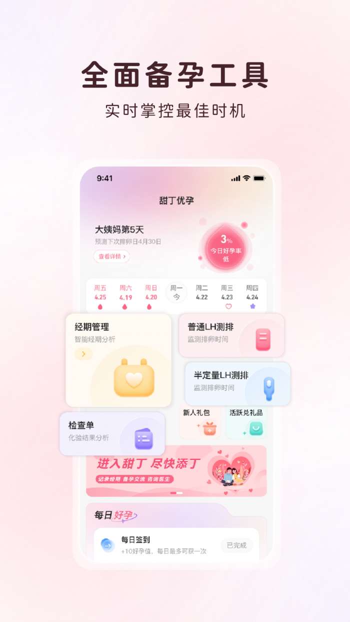 甜丁app支持用户轻松记录和管理经期,智能管理,有效进行全面备份,控制排卵期,智能识别相关试纸,有效收集检查表格,轻松实现备孕。个性化备孕计划可轻松为您定制;而且用户还可以在兑换商城选择孕前产品,进行快速购买和订购。