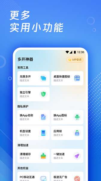 2、广泛的兼容性:支持市场上99%的主流社交、娱乐和办公应用程序的多开,并与所有版本的Android系统兼容。