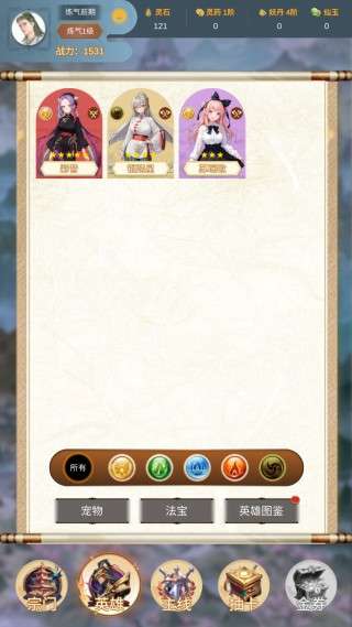 4、查看已拥有英雄的战力与属性,根据 “所有”“五行” 分类筛选英雄,重点培养高战力英雄,同时搭配宠物、法宝提升整体战力。