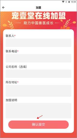 2、输入联系人的姓名和电话号码,公司的基本信息,填写加盟说明,最后点击确认提交即可。