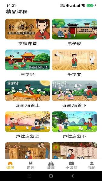 课程选择:在首页点击蒙学系列课程,根据标签筛选弟子规礼仪篇、千字文自然篇等主题。进入课程详情页可预览前三分钟内容。