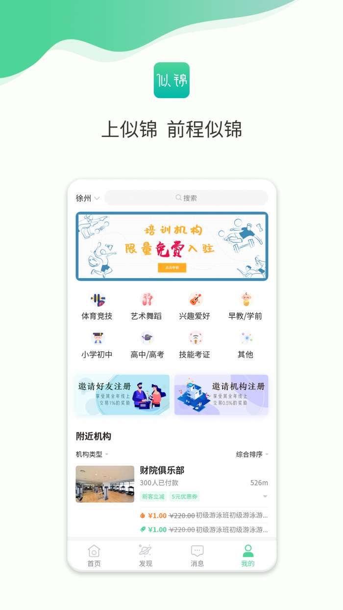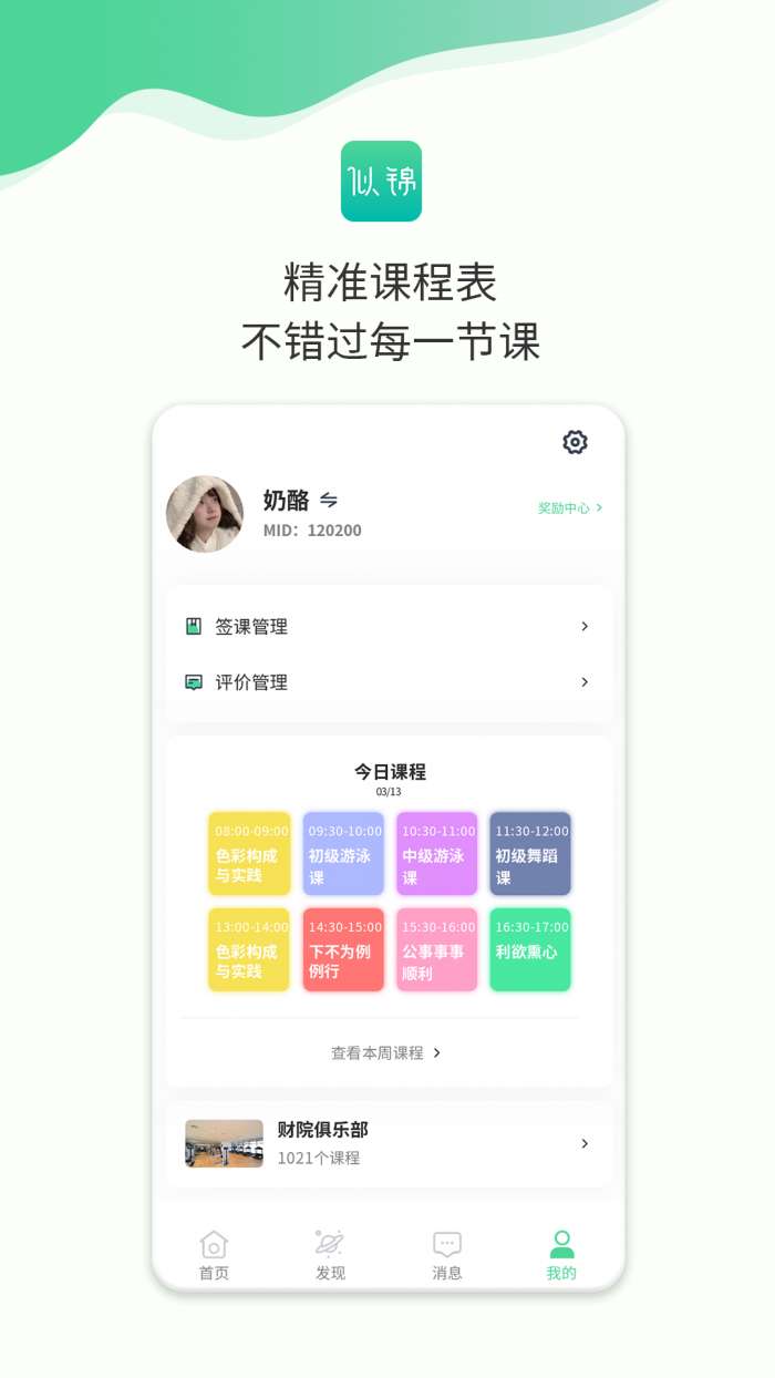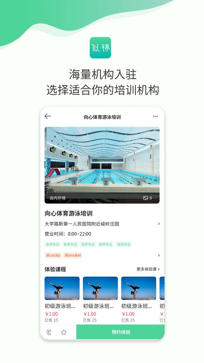 似锦在这款平台上面是有着许多当地入住的培训机构都是能够去进行查看的,而且还有着强大的搜索功能如果看不到你可以直接去进行搜索,可以很好的满足学员们让你们在手机上面就可以直接去进行预约线下体验,而且还有着许多类型分类的课程这些都是能让你在平台上面去更好的选择并去进行培训的,还有着独特的课程安排可以让你在APP上面实时的去查看到你自己的课程培训的详细时间和上课的进度安排等等都是一目了然的,可以更加便捷广大的用户们让培训的教师可以更好的去管理自己的学员,让学员们也更加的便捷自己让你在线上去一键完成报名。