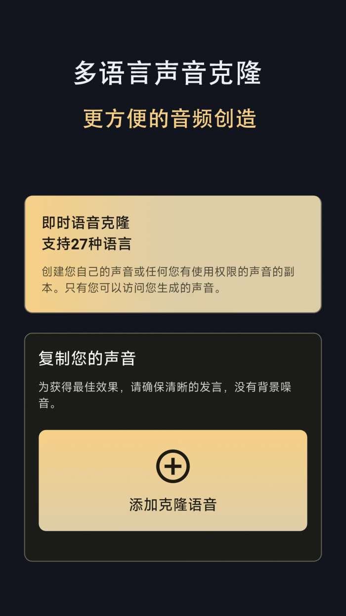 声音克隆大师app是一种创新的语音处理工具,能够准确捕捉和复制用户的声线特征。借助先进的人工智能技术,用户可以轻松实现语音复制、智能旁白等多种功能。该软件包含丰富的声音库,包括多种不同风格的声音特征,从卡通声效到专业的广播口音。操作界面简单直观,支持实时声效调整和个性化设置,使语音克隆过程充满乐趣。让你体验多种不同的声音。