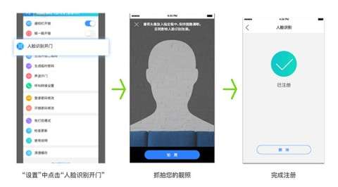 门口机开通人脸识别后,业主只需点击“人脸识别开锁”进行拍照录入,简单又高效。之后在门口机点击“开锁”,通过视频扫描框完成识别,成功率高达95%。
