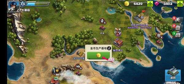 1、进入游戏主界面,按如图所示点击地图进入大地图界面,如图(以金币基地为例)。