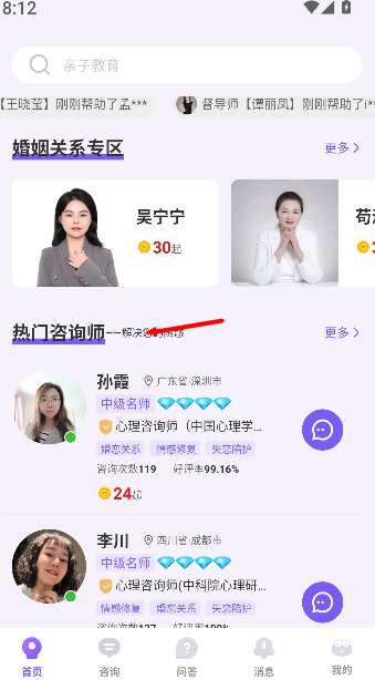 2、专业咨询:提供线上线下心理咨询预约服务,涵盖婚恋、情感压力、亲子教育、职业发展等多个领域。