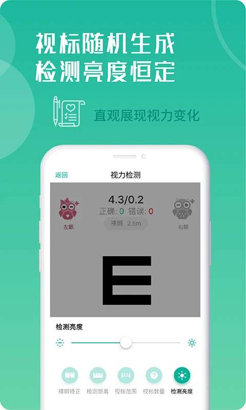 1、个性检查 检测过程可参照国家标准,自由设置视力表测试模式,自由调节检测距离、视标大小、视标数量、屏幕亮度等参数,在确保视力检测准确性的同时提供个性化配置。