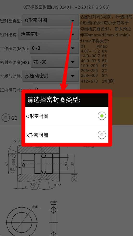 2、点击密封圈类型按钮可选择“O形密封圈”或“X形密封圈”等具体类别。