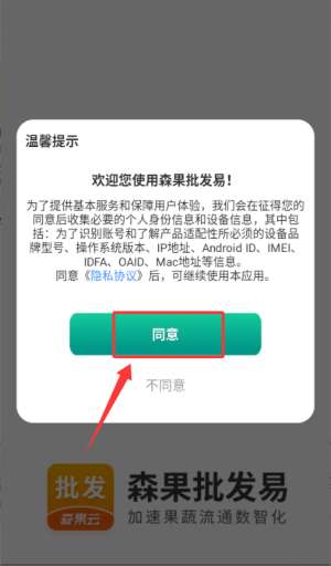 1、在森果批发易,点击“同意”提示进入登录选择界面。