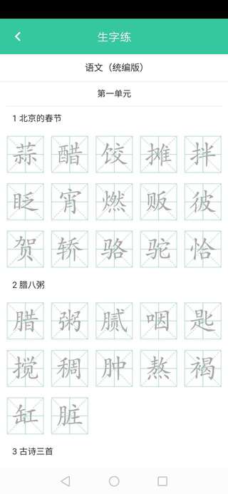 9、点击每一个生字,点击“书写”,有书写笔顺,下面是生字的组词。