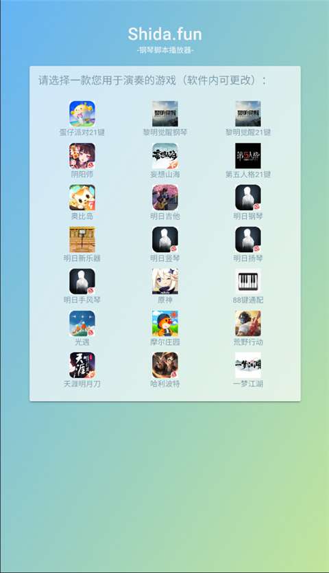 1、下载安装好Shida钢琴助手,初次打开软件会跳转到选择游戏界面,在该界面选中您用于演奏的游戏乐器就可以了(后续可以在软件内更改),这里小编以原神为例子;