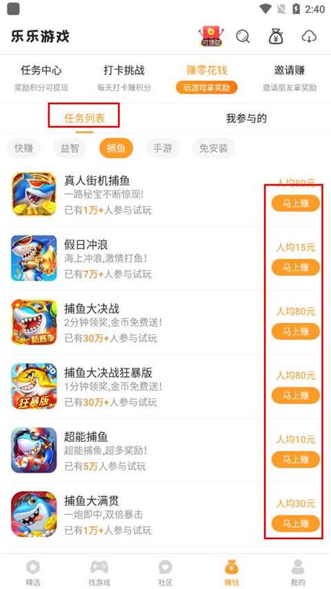 2、接着在【任务列表】处,选择自己喜欢的游戏并点击右侧【马上赚】参与