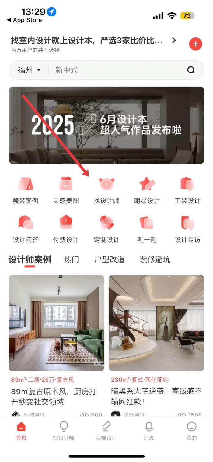 1、打开设计本,点同意服务协议,进首页,选找设计师,浏览案例,开始室内设计需求对接。