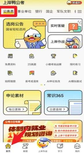 1、在首页点击上方的「公务 员」或「事业单位」标签,即可切换对应考试模块,浏览相关内容与资源。