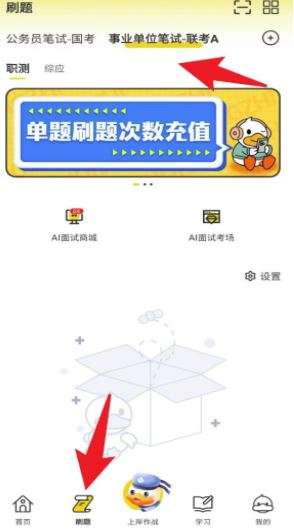 2、点选下方导航栏的「刷题」图标,再进入所选考试类别(如事业单位笔试-联考A),即可进行专项练习。