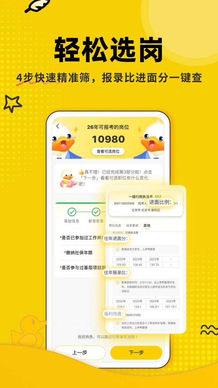 上岸鸭公考app是一个考试练习软件,使您能够快速学习和成长。我们可以根据你申请的职位进行针对性的实践。包括各种历史真题,让您一步到位地练习。该软件致力于为学生提供招聘考试培训,涵盖公务员,事业单位,教师资格和招聘,军队文职人员,中央和国有企业,银行,社会工作者等。拥有千余人的教研团队,深入研究不同地区的特色考试情况和命题趋势,致力于打造“线上线下、全场景、全阶段”的备考模式。