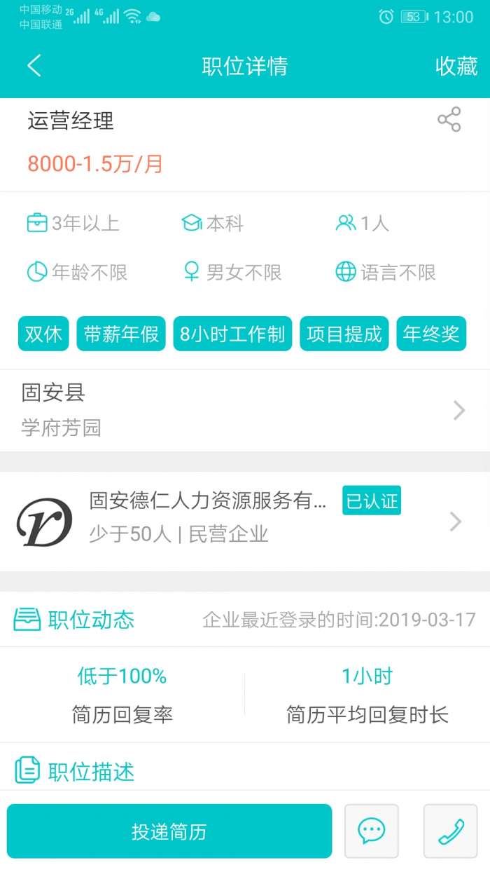 3、这会儿在寻找到个人感兴趣的职位的时候,可以直接线上联系老板进行交流。
