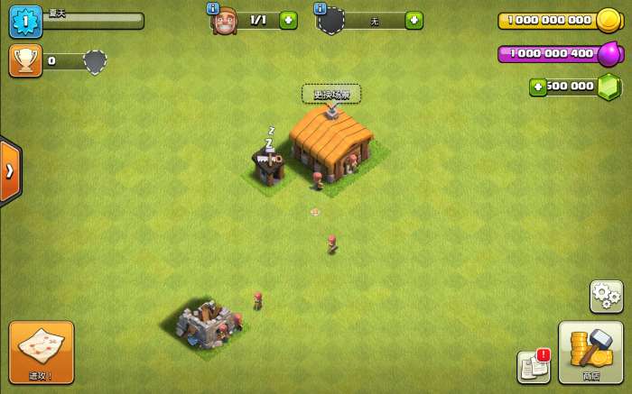 (2)每次玩家进入游戏,默认为村庄地图。玩家在村庄地图中建造大本营、城墙、兵营等建筑,产生更多的资源,提升自己的军事实力。在村庄地图中,玩家可以查询自己的等级、货币、资源数量、建筑数量等信息,还可以训练兵种、升级建筑等级、收集各种资源、布置各种资源和建筑。