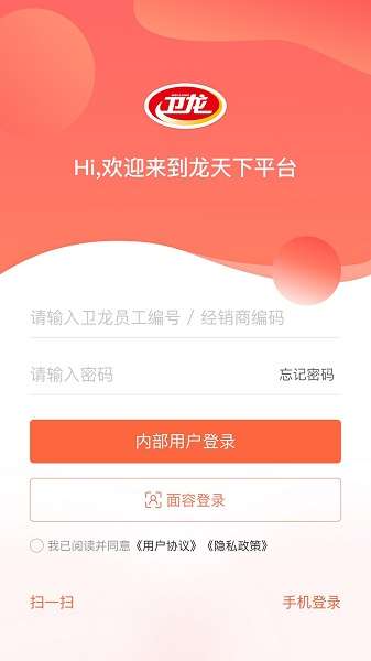 1、下载并打开卫龙龙天下APP,即可输入员工编号或经销商编号和密码登录。