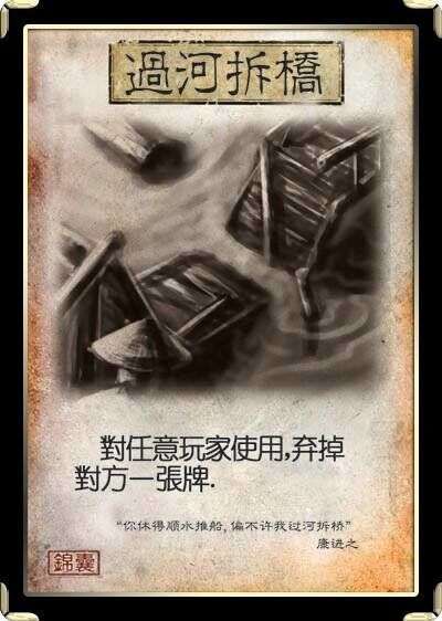 【过河拆桥/顺手牵羊】这两张锦囊牌的作用类似,都是耗费敌人一张牌,不过【顺手牵羊】更好,毕竟可以增加自己一张牌。所以在面对【过河拆桥】时可以忍一忍,但是面对【顺手牵羊】时一定不要犹豫,直接【无懈可击】。保存自己的关键牌,在战斗中十分有用。