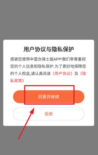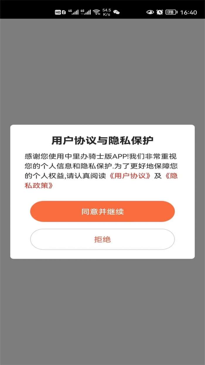 1、下载安装并打开中里办骑士版app,先用户协议与隐私保护;