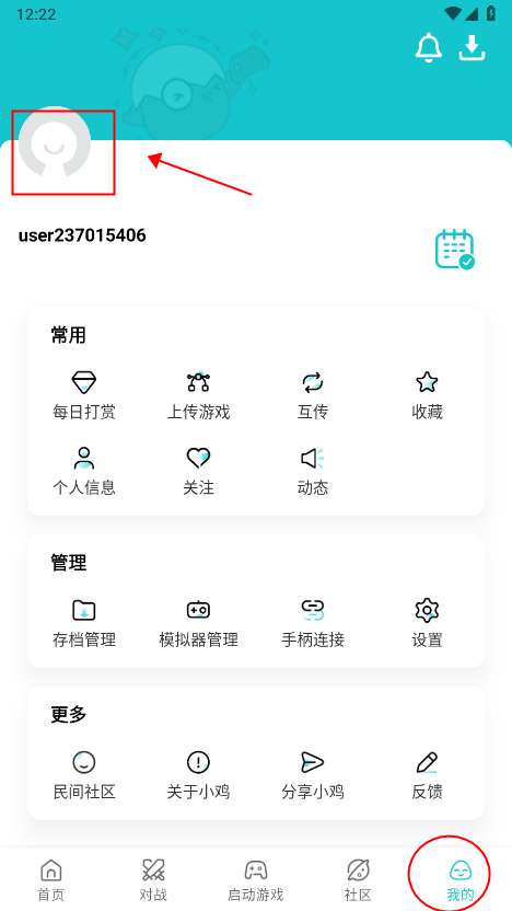 1、进入小鸡模拟器,点击我的,可以看到系统已经默认生成了一个账号,点击头像。